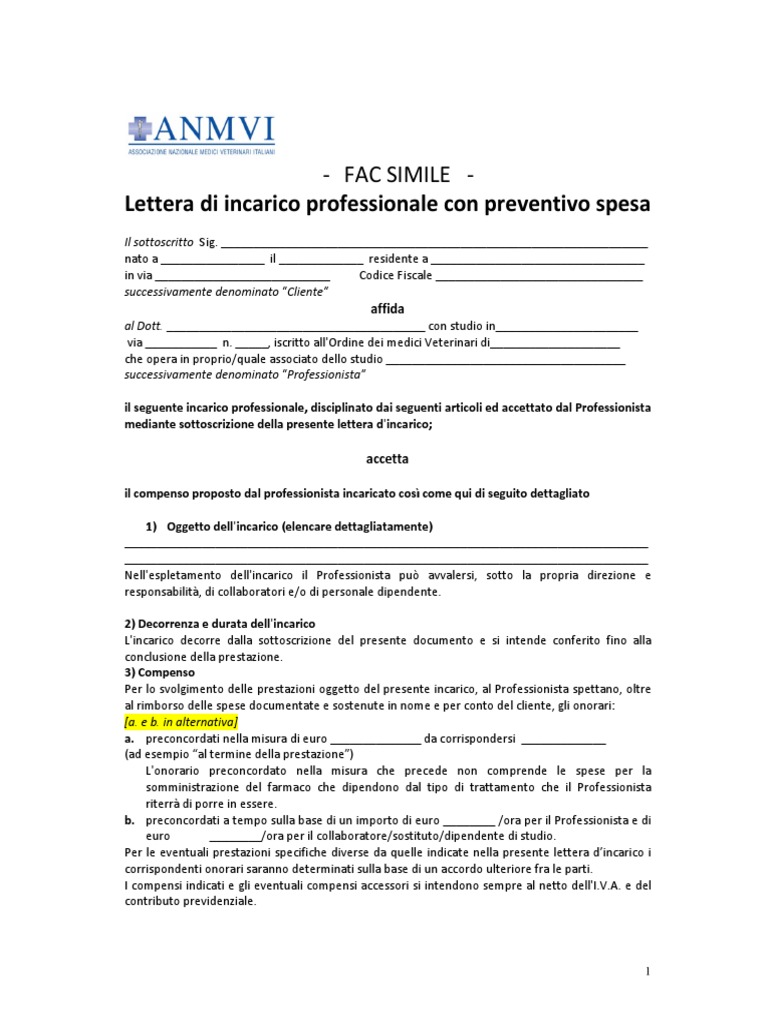 Modello Lettera di Incarico Generica - Moduli Editabili La lettera di incarico è un documento tramite il quale un professionista si accorda con il cliente relativamente al servizio da svolgere, disciplinando l'attività e il relativo corrispettivo. La lettera di incarico garantisce trasparenza nel rapporto con il cliente evitando così eventuali contenziosi relativi al pagamento della parcella.