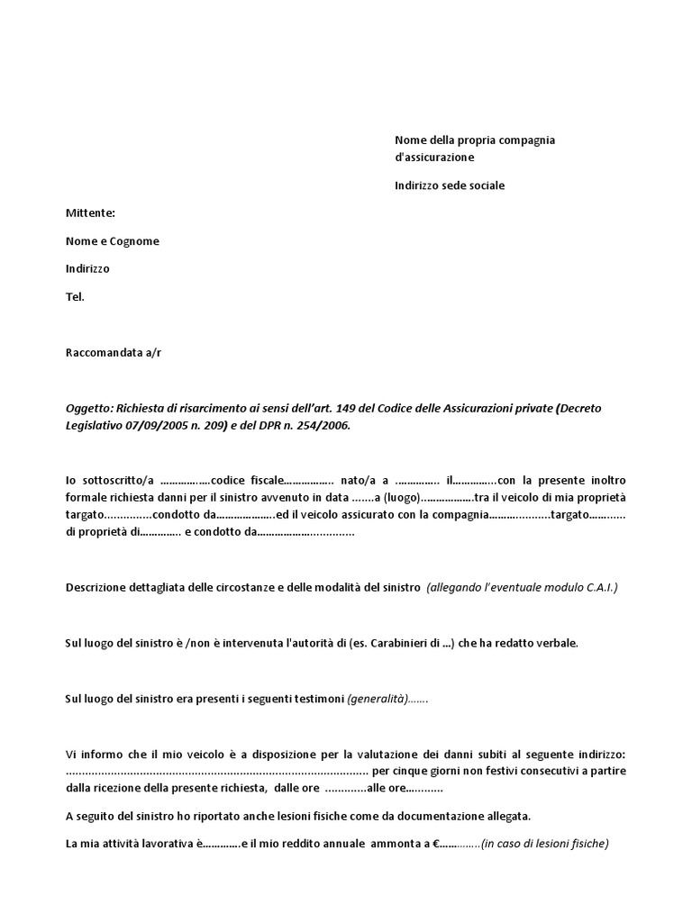 Fac simile lettera risarcimento danni indennizzo diretto. Lettera per la richiesta di risarcimento danni da incidente stradale Sep 27, 2022 ... modulo richiesta danni a Compagnia responsabile Oggetto: Richiesta di risarcimento ai sensi degli articoli 145 e 148 del Codice delle. Assicurazioni private (Decreto Legislativo 209 del 07/09/2005). Lettera per la richiesta di risarcimento danni da incidente stradale Oct 10, 2022 ... Fac simile di richiesta risarcimento danni - SG Studio Legale Jan 30, 2022 ... La richiesta di risarcimento per indennizzo diretto deve essere inviata: ... La richiesta va indirizzata ed inviata alle sedi legali delle ...