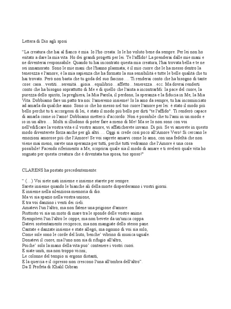 LETTERA AD UNA SPOSA - acannone.it LETTERA AD UNA SPOSA. IL GIORNO DEL MATRIMONIO. Barbiana,30.3.56. Cara Simona, il motivo principale per cui un cristiano prende moglie è quello d'aver sempre tra i piedi una donna che gli ricordi giorno per giorno gli alti ideali per cui egli ha promesso di vivere e dai quali gli impegni di lavoro rischiano giorno per giorno di distrarlo. lettera di dio ad uno sposo - YouTube lettera di dio ad uno sposo 42,529 views Sep 1, 2009 77 Dislike Share Save melaegae 17 subscribers una poesia trovata su internet,bellissima a mio parere....kissà ke il giorno del mio...