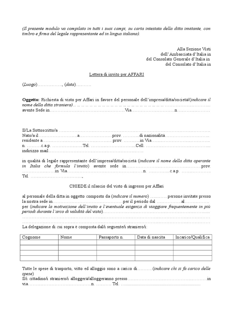 LETTERA DI INVITO - Cinformi LETTERA DI INVITO. Il/la sottoscritto/a… ... con la presente comunica di voler invitare per motivi di turismo il/la cittadino/a straniero/a… dichiarazione garanzia e/o alloggio - Il visto per l'Italia Luogo di nascita/ Place of birth. Nazionalità/Nationality. Documento di identità/Identity card. Passaporto/Passport. Permesso di soggiorno/Residence permit.